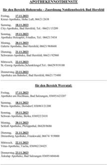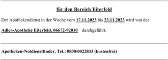Der Apothekendienst in der Woche vom 17.11.2023 bis 23.11.2023 wird von der Adler-Apotheke Eiterfeld, 06672-92010 durchgeführt.