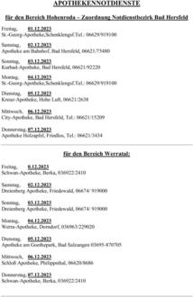 Der Apothekendienst in der Woche vom 01.12.2023 bis 07.12.2023 wird von der Haune-Apotheke Haunetal, Tel. 06673-350 durchgeführt.