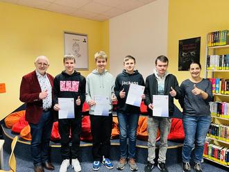 Im Bild v. links: Schulleiter Klaus Amlung, Merlin Rudolph, Julian Steinhauer, Till Peters, Janik Zier und Koordinatorin und Mathematiklehrerin Sandra Möller