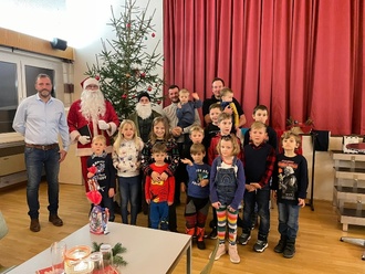 Auf dem Foto der erste Vorsitzende Axel Bredy, die beschenkten Kinder mit Weihnachtsmann und Knecht Ruprecht.