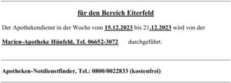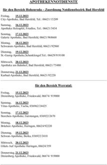Der Apothekendienst in der Woche vom 15.12.2023 bis 21.12.2023 wird von der Marien-Apotheke Hünfeld, Tel.: 06652-3072 durchgeführt.