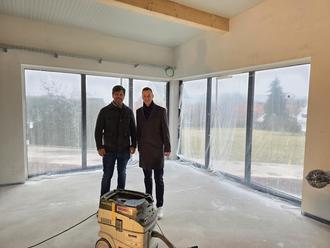 Bürgermeister Andre Stenda (rechts) und Bauamtsleiter Patrick Pingitzer vergewissern sich vom Baufortschritt im zukünftigen Tante Enso.