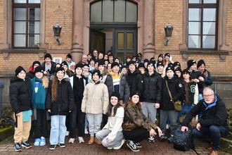 Im 43ten Jahre des deutsch-französischen Jugendaustausch (gefördert durch das deutsch-französische Jugendwerk DFJW) war kürzlich eine Reisegruppe aus der Homberger Partnerstadt Thouaré hier zu Gast. Eine Rekordteilnehmerzahl von diesmal 41 Schülern und 14 Begleitern hatten es sich für eine Woche vom 24.2. bis 2.3. in Homberg heimisch gemacht. Viele neue Gesichter unter den Schülern, aber auch Teilnehmer, die schon zum 6ten Mal den über 1100 km langen Anreiseweg von Thouaré nach Homberg auf sich nahmen. Am Samstagabend wurde der bis auf den letzten Platz besetzte Reisebus mit großem Hallo von den Gastfamilien begeistert empfangen. Der Sonntag stand wie immer im Zeichen des Kennenlernens in den Familien und viele verbanden dies mit Tagesausflügen in die nähere Umgebung wie Schlittschuhlaufen in Lauterbach, Lasertag-Battles in Giessen, Stadtsightseeingtouren in Fulda, Willingen oder Marburg.