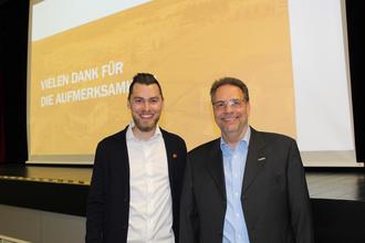 CCD-Vorstandsmitglied Michael Parsch (r.) begrüßt Jannik Gasse, der in Kirchhain die Strategie der Finger Haus GmbH zur Azubi-Gewinnung vorstellte. Foto: THM/StudiumPlus