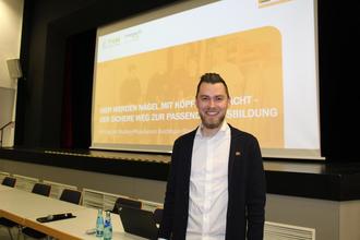 „Hier werden Nägel mit Köpfen gemacht - der sichere Weg zur passenden Ausbildung“ lautete der Titel des Vortrags, mit dem Gasse einen Überblick über die vielfältigen Aktivitäten seines Unternehmens zur Akquirierung von Nachwuchs gab. Der 31-Jährige hat selbst eine Ausbildung bei FingerHaus gemacht, einem der größten Fertighaushersteller Deutschlands. Anschließend studierte er dual am Campus Bad Wildungen von StudiumPlus Betriebswirtschaft. Heute betreut er die aktuellen Studierenden - Finger Haus bietet drei Bachelor-Studiengänge und 14 Ausbildungsberufe an. Möglich ist ein duales Studium Bauingenieurwesen oder Betriebswirtschaft ebenso wie eine Ausbildung zum Zimmerer, Bauzeichner oder Industriekaufmann.