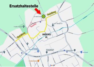 In der Grafik ist die abgestimmte Umleitungsstrecke abgebildet. Die Schulbusse werden über die Kirchhainer Straße und Marburger Straße geführt. Die reguläre Haltestelle Grundschule wird in diesem Zeitraum nicht bedient. Die Ersatzhaltestelle ist auf der Ecke Dorfgraben/ Kirchhainer Straße aufgestellt.