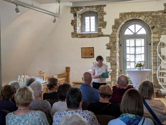 Inge Christ eröffnet die Ausstellung ihrer Stickarbeiten, Bick/Stadt Homberg (Ohm)