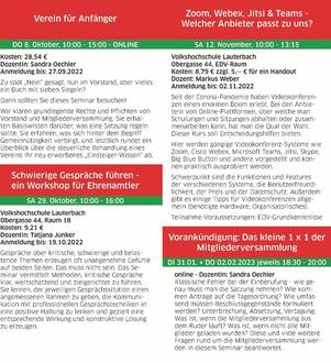 Im aktuellen Herbstprogramm werden Fortbildungen zu Grundlagen im zur Führung schwieriger Gespräche, zu Videokonferenzen oder Informationen zur Organisation von Mitgliederversammlungen angeboten.