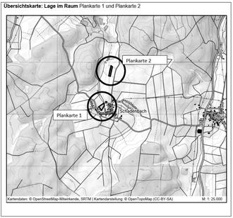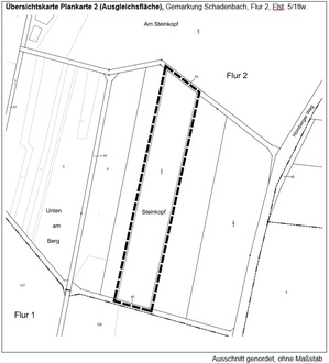 (2) Die Abgrenzung des Geltungsbereiches Plankarte 1 (Mischgebiet) beinhaltet die Flurstücke 101/2, 177/1tlw., 178/1tlw., 206/1tlw., 207tlw. und 208tlw. in der Flur 1, jeweils Gemarkung Schadenbach. Der Geltungsbereich befindet sich im Norden der Ortslage an den Straßen Am Bornweg und Zum Herrnberg und kann der nachfolgenden Übersichtskarte entnommen werden. Hinzu kommt eine externe Ausgleichsfläche in der Gemarkung Schadenbach Flur 2, Flst. 5/1tlw. (Plankarte 2).