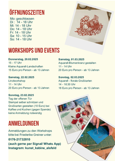 Workshop-Termine, Preise und weitere Informationen sind auf ausliegenden Flyern, vor Ort im Schaufenster des PLAN B oder telefonisch unter 0176 21732810 erhältlich. Beide Künstlerinnen freuen sich auf zahlreiche Besucher und Besucherinnen sowie den kreativen Austausch.