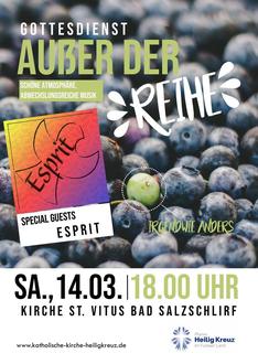 | 18.00 Uhr | BSa | Gottesdienst „Außer der Reihe“ mit der Gruppe Esprit (wird als Heilige Messe gefeiert) |