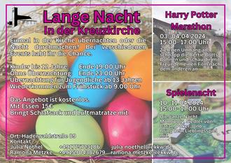 | 15:00 Uhr | Lange Nacht der Spiele - Die ganze Nacht Monopoly, Siedler von Catan, Poker, Uno… Ihr könnt jederzeit dazu kommen, euch setzen und auch jederzeit wieder gehen. Wer etwas essen möchte, bringt bitte 15 € mit. Ansonsten ist das Angebot kostenlos. Übernachten dürfen Jugend-liche ab 13 Jahren. Für Kinder bis 12 Jahre ist 19 Uhr Ende. Für Jugendliche, die nicht übernachten wollen ist 23.00 Uhr Ende. Ab 9.00 Uhr am nächsten Tag dürfen alle zum Frühstück wiederkommen. Weitere Infos bei Julia Nöthel: julia.noethel@ekkw.de oder 0177 5723186. |