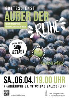 | 19.00 Uhr | BSa | Gottesdienst „Außer der Reihe“ mit Sina Jestädt |