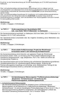 Der Gemeindevorstand wird mit der Einleitung des erforderlichen Bauleitplanungsverfahrens (Aufstellungsbeschluss für vorhabenbezogenen Bebauungsplan, Änderung des Flächennutzungsplans) beauftragt und ermächtigt, einen städtebaulichen Vertrag mit der RhönEnergie Erneuerbare GmbH zu verhandeln und abzuschließen.