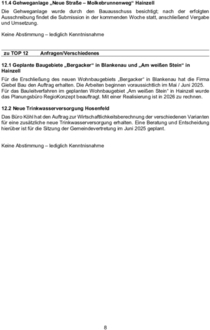 Für fünf Bauplätze lagen sechs konkrete Bewerbungen vor. Die Vergabe wurde vom Gemeindevorstand nach dem erstellten Kriterienkatalog vorgenommen und der HLG mitgeteilt; eine Warteliste besteht.