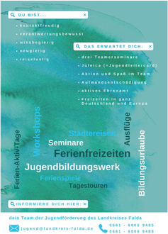 Bei der Jugendförderung und dem Jugendbildungswerk des Landkreises Fulda kannst Du Teamer: in werden und auf eine Vielzahl an Tages- und Wochenendveranstaltungen sowie Ferienfreizeiten oder Bildungsurlauben rund um Fulda, Deutschland und Europa mitfahren.