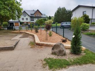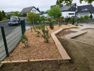 Nachdem der gemeindliche Bauhof den äußeren Zufahrtsbereich durch die Versetzung des Zauns vergrößert hatte, ist nun im zweiten Schritt der alte Hecken- und Wurzelbestand entfernt und komplett durch neue Pflanzen sowie einer Holzbalken-Einfriedung mit Abdeckung des Beets mit Holzhackschnitzels ersetzt worden. Damit hat der Bauhof wieder einmal Kreativität und ein „ökologisches Händchen“ aufgrund des Einsatzes von natürlichen Materialen bewiesen.