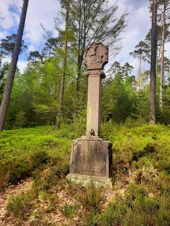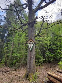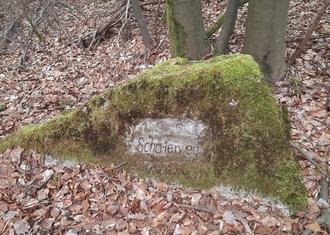 Der weitere Weg führte uns zum „Hesche“, ein Bildstock auf dem ein Hirsch mit einem Hubertuskreuz abgebildet ist. Nach der Recherche von Albert Kohlmann handelt es sich hier um den Eustachius Bildstock. (Eustachiuskreuz, Hubertuskreuz).
