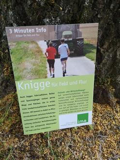 Um solche Probleme zu vermeiden und für ein geregeltes und ordentliches Nebeneinander von Landwirtschaft und Freizeit gibt es einen neuen Infoflyer, den „Knigge für Feld und Flur“. Mit diesem können Sie sich innerhalb von drei Minuten schlau machen, was z.B. auf Feldwegen erlaubt ist und was nicht.