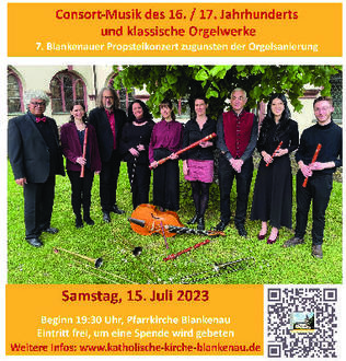 Im Rahmen des Kultursommers Main-Kinzig-Fulda findet am Samstag, 15. Juli 2023, Beginn 19:30 Uhr, in der Pfarrkirche St. Simon und Judas, das 7. Blankenauer Propsteikonzert statt. Auf dem Programm stehen Consort-Musik des 16. und 17. Jahrhunderts, interpretiert vom Salvatoris Consort und klassische Orgelwerke, gespielt von Regionalkantor Ulrich Moormann.
