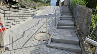 Nach erfolgreichem Abschluss der Arbeiten, die fachmännisch und zügig ausgeführt wurden, ist nun eine schöne und funktionelle Gehweganlage entstanden, die Barriere reduziert ist und einen halbseitig kombinierten Auf- und Abgang aufweist, bei dem man die Treppen- oder stufenfreie Seite nutzen kann, z. B. für Rollatoren oder Kinderwägen, und die mit einem Geländer in der Mitte unterteilt sind. Die Kosten sind am Ende mit rund 72.500 Euro sogar etwas unter der Kalkulation geblieben.