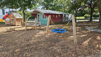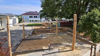 In einem ersten Schritt - und noch vor der 50. Geburtstagsfeier am 29. Juni 2024 - überarbeitete der gemeindeeigene Bauhof unter Leiter Joachim Schmitt Spielplatzumrandung, Sandkasten und Oberflächen, Zuwegungen und Anpflanzungen -alles naturnah: Sandkasten und Pflanzrabatte wurden mit Rundhölzer eingefasst und die Oberflächen mit Rindenmulch bedeckt.