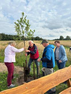 In Teamarbeit wurde nicht nur eine Sitzgelegenheit errichtet, sondern auch ein stabiles Podest angelegt, das für festen Stand bei jedem Wetter sorgt. Ein frisch gepflanztes Apfelbäumchen wird bald kühlen Schatten und leckere Früchte spenden.