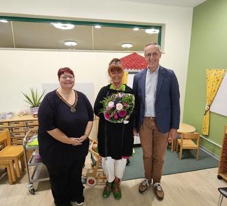 Im Rahmen einer kleinen Feierstunde wurden ihr Blumen vom Bürgermeister und ein Geschenk vom Team überreicht, verbunden mit einem herzlichen Dankeschön für Ihren jahrelangen Einsatz als Erzieherin, den sie mit viel Herzblut und Liebe ausübte.
