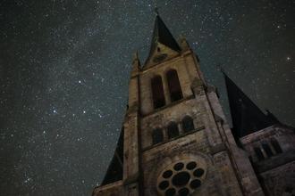 Die Stadtkirche von Tann im Sternenlicht mit dem Sternbild Cassiopeia