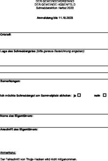 Um einen Überblick über das anfallende Schreddergut zu erhalten, wird gebeten sich bei der Gemeindeverwaltung Hosenfeld, Telefon: 06650/9620-0 oder 9620-27, unter Angabe der genauen Anschrift anzumelden oder das nachstehende Formblatt ausgefüllt bis 11. Oktober 2023 abzugeben.