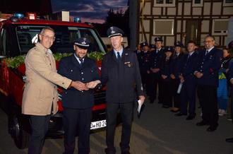 Dann endlich fuhr das neue Einsatzfahrzeug, besetzt mit Landrat Bernd Woide, GBI Elmar Weinbörner, KBI Adrian Vogler, Pfarrer Sebastian Latsch, Bürgermeister Peter Malolepszy und Wehrführer Jürgen Möller vor und wurde im Anschluss durch den Pfarrer geweiht. Nach der Schlüsselübergabe durch den Bürgermeister an Jürgen Möller erhielt er zudem, für seine bisherigen Verdienste das Ehrenzeichen in Bronze. Das alles wurde natürlich im Anschluss mit allen Anwesenden gebührend gefeiert.