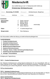 Protokoll Ortsbeiratssitzung Nr. 9 Schletzenhausen