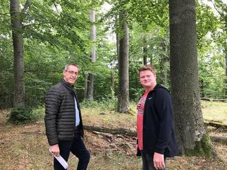 Bürgermeister Peter Malolepszy und Maximilian Koch begehen die „Hainburg“ bei Blankenau