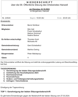 Niederschrift über die 09. Öffentliche Sitzung des Ortsbeirates Hainzell