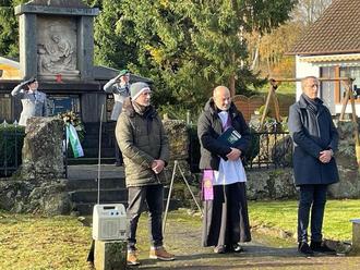 Gedenkfeier am Ehrenmal in Schletzenhausen (v.l.n.r.: Ortsvorsteher Hermann Dentel, Diakon Gofryk, Bürgermeister Peter Malolepszy; im Hintergrund Abordnung der Reservisten)