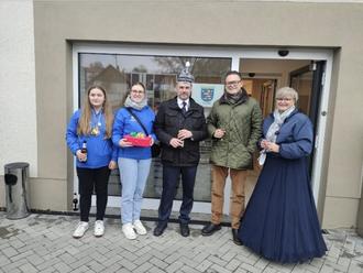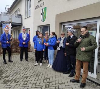 Vor der Gemeindeverwaltung wurden sie herzlich vom Bürgermeister Frederik Hohnstein begrüßt, der den Närrinnen und Narren ein fröhliches Willkommen bereitete. Bei einem kleinen Umtrunk wurde gemeinsam auf den Beginn der neuen Karnevalssaison angestoßen.