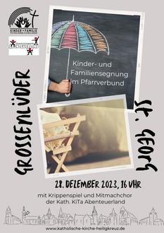 Herzliche Einladung zum Kindersegnungsgottesdienst mit musikalischem Krippenspiel der Katholischen Kindertagesstätte Abenteuerland am Donnerstag, den 28. Dezember 2023, um 16 Uhr in der Pfarrkirche St. Georg.
