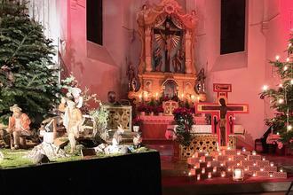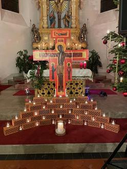 Zum zweiten Mal fand in der Pfarrkirche Hainzell am 19.01.2024 ein Taizé-Abend statt: trotz „schwierigem“ Winterwetter waren gut 100 Personen der Einladung des Pfarrgemeinderates gefolgt. Ein Zeichen, dass die Premiere 2023 gut ankam und ein Bedürfnis nach einer solchen Besinnungsstunde im mit Kerzen erleuchteten Gotteshaus besteht. Schon der Anblick von der Krippe hin zum Kreuz als Mittelpunkt mit den Lichter-Bausteinen bis zum stolzen Christbaum war ein „Genuss“. Geistlicher Begleiter war erneut Diakon Markus Hildebrand, Katja Malolepszy übernahm die Organisation und Klaus Fischer die Altarraum-Beleuchtung. Die Texte wurden von Damen des PGR vorgetragen. Ein „Highlight“ waren die musikalischen Beiträge durch Viktoria Blumenthal und Lukas Streitenberger mit Liedern wie u.a. „Laudate omnes gentes“ und „Meine Hoffnung und meine Freude“: sehr eingehend gesanglich vorgetragen, untermalt mit Keyboard, Gitarre und Kontrabass. Nach über einer Stunde gingen die Besucher mit „gutem Gefühl“ und „Schutzengel-Präsent“ nach Hause. Das Team lies den Abend im Pfarrhaus mit Glühwein in einer fröhlichen Gesprächsrunde ausklingen. Herzlichen Dank an alle! Zu erwähnen sind hierbei auch mal die Krippenbauer Michael Menigat, Udo Schmitt und - neu - Patrick Wehner: zum Jubiläum „800 Jahre christliche Krippen“ (Hl. Franziskus) ist die prächtige Hainzeller Krippe wieder ein besonderer Blickfang.