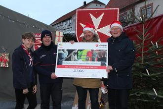 Hosenfeld-Blankenau. Nachdem die beiden Blankenauer „Hopperain-Spieler“ Jürgen von Keitz und Matthias Bickert vor Kurzem einen Scheck in Höhe von 2750,--€ an die Lebenshilfe Fulda-Hünfeld übergeben hatten, konnten sie nun am Weihnachtsmarkt der Blankenauer Vereine am 11. Dezember an das Aktionsbündnis „Deutschland hilft“, zu dem auch der Malteser Hilfsdienst gehört, einen weiteren Scheck über 2750,--€ an die Organisation für die Hilfe in der Ukraine übergeben. Andreas Honikel und Vanessa von Keitz von der Ortsgruppe der Malteser aus Blankenau/Hainzell konnten den symbolischen Scheck der beiden Musiker entgegen nehmen. Sie bedankten sich im Namen des Malteser Ordens in Deutschland mit Sitz in Köln und würdigten mit Lobesworten das Jahrzehnte lange handeln der beiden Wohltäter und hoffen, dass die beiden Flügelhornisten noch viele weitere Jahre mit ihren Spenden Hilfsorganisationen unterstützen.