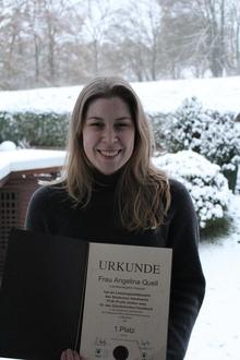 Aber mit genug Adrenalin im Blut konnte die Aufgabenstellung in der vorgegebenen Zeit von 6 Stunden bewältigt werden. Angelina hatte Ihre Aufgaben pünktlich abgegeben, um kurz danach festzustellen, dass sie eigentlich noch etwas an ihrer Arbeit vergessen hatte. Somit fieberte sie, mit nicht allzu großen Erwartungen, der Siegerehrung entgegen. Einen Treppchenplatz hatte sie sich im Stillen erhofft, aber nachdem Platz drei und zwei aufgerufen wurden, schwanden ihre Hoffnungen und sie registrierte gar nicht, als dann beim ersten Platz ihr Name genannt wurde. Ihre Sitznachbarin sagte, sie müsse schon aufstehen und nach vorne gehen. Die Überraschung und die Freude waren riesengroß.