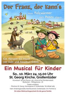 Seit dem 1. Dez. 2023 läuft der Kartenvorverkauf für das Kindermusical: „Der Franz, der kann`s.“ Gabi und Amadeus Eidner sind zu Gast bei uns mit Ihrer Aufführung am So., 10.03.2024 um 15 Uhr in der St. Georg Kirche, Großenlüder. Der Einlass ist ab 14.15 Uhr mit freier Platzwahl.