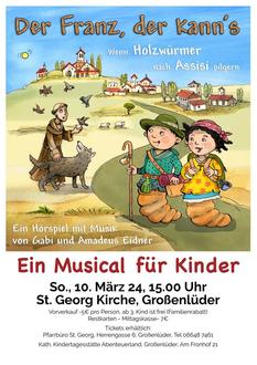 Seit dem 1. Dez. 2023 läuft der Kartenvorverkauf für das Kindermusical: „Der Franz, der kann`s.“ Gabi und Amadeus Eidner sind zu Gast bei uns mit Ihrer Aufführung am So., 10.03.2024 um 15 Uhr in der St. Georg Kirche, Großenlüder. Der Einlass ist ab 14.15 Uhr mit freier Platzwahl.