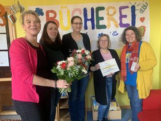 Silke Hertstein (2.von rechts) und Silke Vöbel-Kempke (rechts) werden von der Kitaleitung und der Verwaltung für ihren Erfolg gefeiert