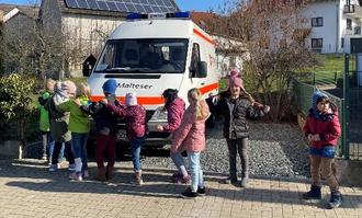 Jedes Kind erhielt ein Päckchen mit unterschiedlichem Verbandsmaterial. Gegenseitig wurden nun Pflaster korrekt aufgeklebt sowie ein Wundverband und ein Druckverband angebracht. Wer wollte, durfte sogar einen Kopfverband anlegen. Als Highlight hatte Anna Beil einen echten Krankenwagen der Malteser mitgebracht, in dem alle Kinder nicht nur auf der Krankenliege probeliegen, sondern sich auch hinters Steuer setzen durften.