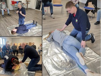 Einsatzkräfte der Feuerwehr müssen neben der feuerwehrtechnischen Ausbildung auch die Erste Hilfe für den Einsatzfall beherrschen. Regelmäßig werden Kurse besucht, wie jetzt vom DRK Wetzlar im Hüttenberger Feuerwehrhaus. DRK-Ausbilder Martin Goy zeigte die ganze Bandbreite vom Verband über die stabile Seitenlage bis hin zur Herz-Lungen-Wiederbelebung. In der Hüttenberger Feuerwehr sind auch einige Rettungssanitäter, die durch die Ersthelfer in Notfällen gut unterstützt werden können. Danke an die Teilnehmer und an Martin Goy vom DRK Wetzlar.