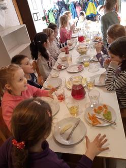 Zum Abschluss sitzen alle Vorschul-Füchse an einem langen Tisch und probieren ganz viel Obst, Gemüse und auch Vollkornprodukte einfach mal aus.