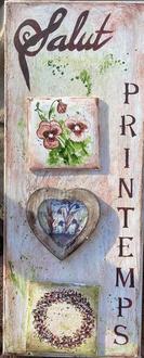 Wir malen zunächst einfache Frühlingsmotive auf Minileinwände, dann bereiten wir die 50 x 20 cm große Leinwand vor in Mal- und Schablonentechniken im Frühlingsdesign und nach Wahl mit Schrift, die in Schablonentechnik aufgebracht wird. Abschließend verbinden wir die vorbereiteten Elemente mit der Leinwand.