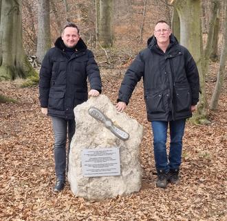 Mirko Mank und Christian Lehnhardt im Litzer Feld: Das auf dem Gedenkstein befestigte Propellersymbol wurde von Christian Lehnhard aus den Original-Aluminium-Wrackteilen des Flugzeugs gegossen