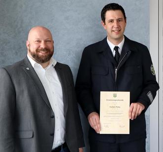 Bürgermeister Oliver Hölz mit dem neuen Gemeindebrandinspektor Benedikt Kummer