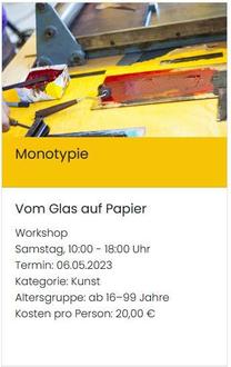 Bei einer Monotypie erfolgt die Bildgestaltung zuerst als Druckvorgang indem Farbe auf eine Glasplatte aufgetragen und noch feucht auf Papier gedruckt wird. Diese Monotypien gestalten wir malerisch weiter, konkretisieren oder abstrahieren nach eigenem Entwurf und unter fachkundiger Anleitung. Aus überraschenden Strukturen, Farbverläufen und Linien entstehen ganz individuelle Werke.